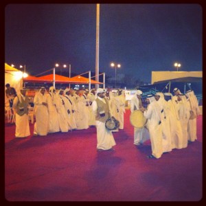 Outside of the bougie party (strings and opera singer, included), there was a great display of traditional Qatari dancing. It consisted of many men, each carrying a sword, swaying forwarding and backward and swinging their swords to the beat of a drum. There were two drummers and one man singing (or chanting, I couldn’t say properly which one).